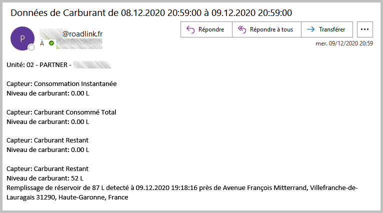 Si aucune donnée n'existe, un email avec le texte Niveau de carburant inconnu est envoyé.