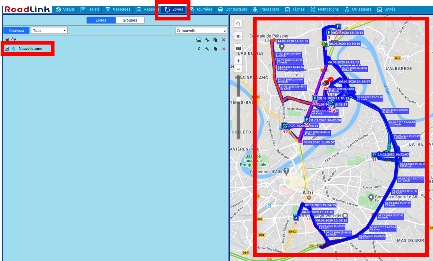 Pour voir l'intégralité des trajets sur la carte, clqiuez simplement sur le nom de l'unité dans la liste de gauche.